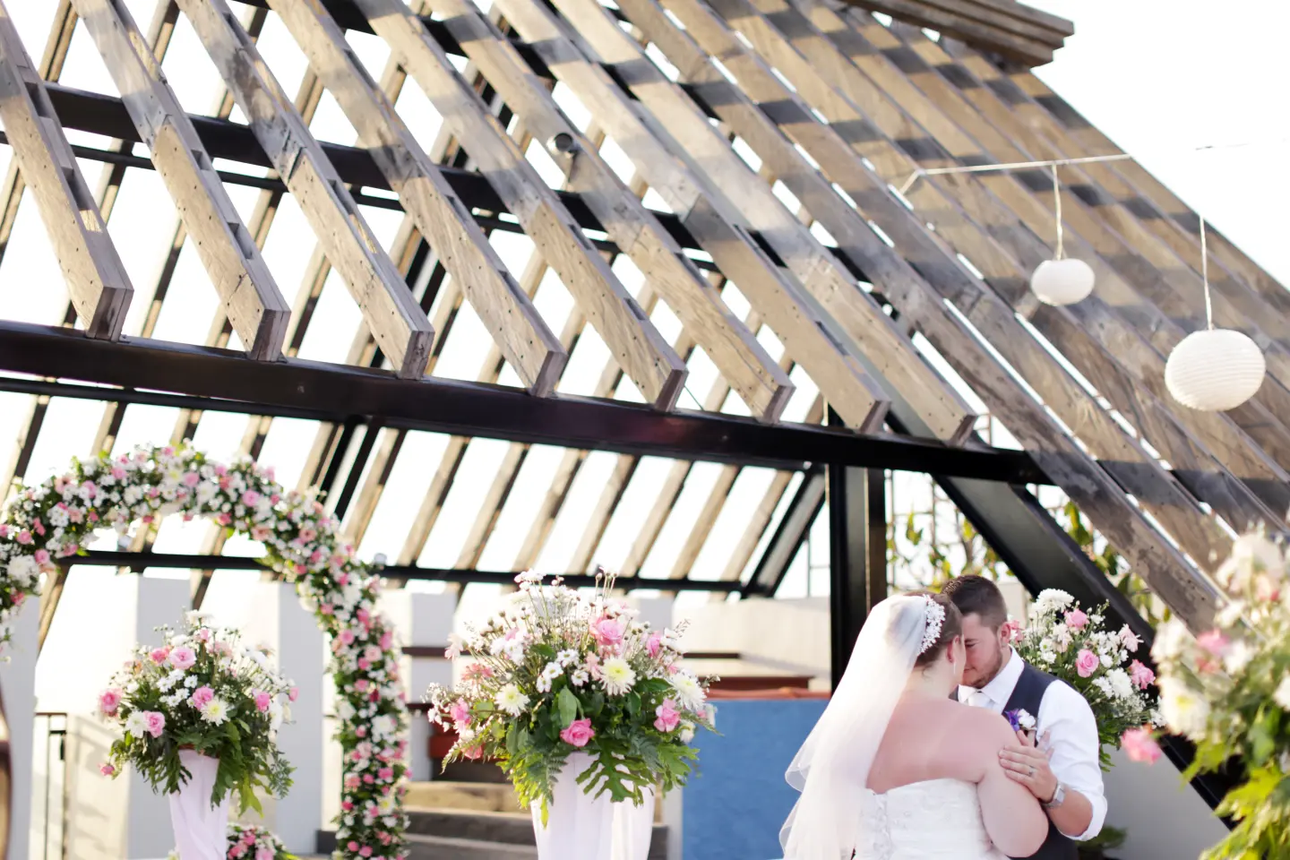 The self-tailored rooftop deck makes a beautiful setting for a pre-sunset wedding, against the backdrop of the exotic Kuta neighborhood.